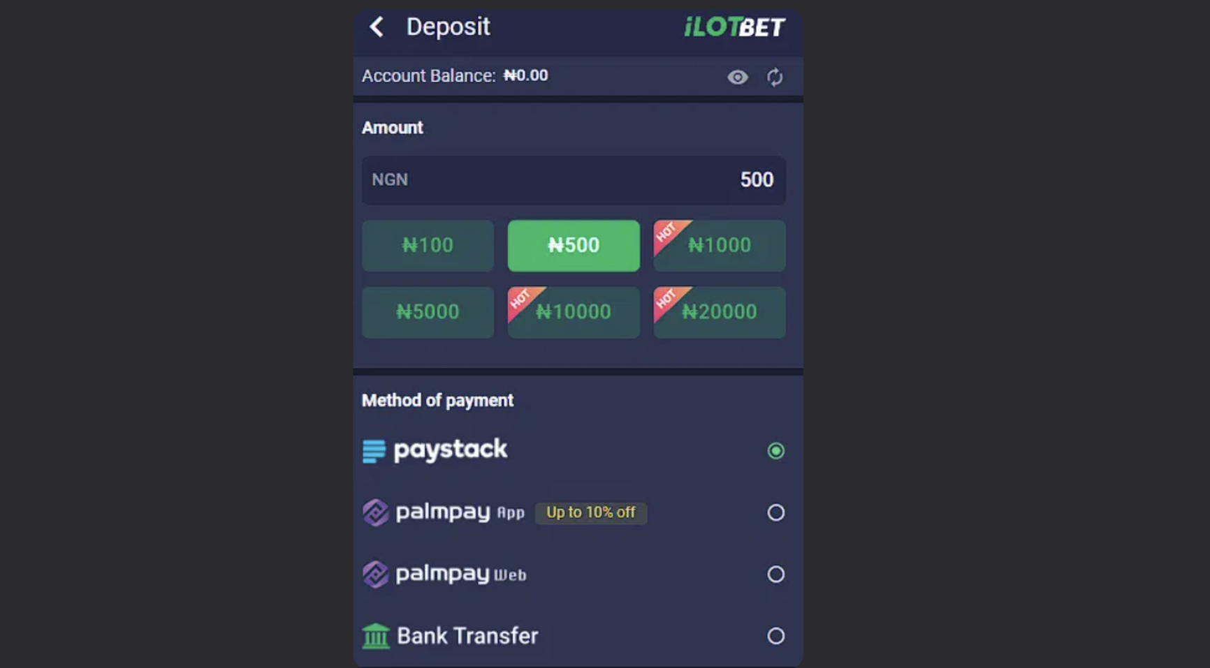 iLot Bet will propose a specific deposit amount: if it’s shown in the wrong currency, just select the right one. After that, either click on the pre-made option that suits your intentions or type any amount you want.